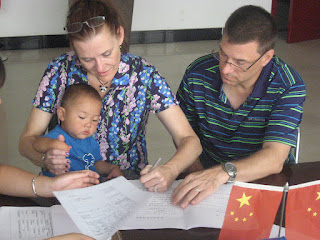 Doing some red ink fingerprinting stuff. I am not sure what we were agreeing to at this point...I think to keep him with us for 24 hours and that we had the right child. Here you can glimpse the little "Yuncheng heart" Zack was wearing. He was beebopping around the room making sure not to get too close to us.