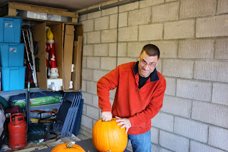 Halloween is inherently cheesy, but we have fun with it. We had some cheesy-in-a-good-way family fun the Sunday before Halloween. The weather was yucky so we took the cars out of the garage and set up pumpkin carving shop. Carving pumpkins with Hubs is quite an experience. He tends to scoff at the generic triangle eyes and snaggle toothed jack-o-lanterns. Those are for amateurs. Around here, we get our pumpkin patterns off the internet and do it up fancy. It takes some patience, which I do not have. Hubs finished my pumpkin (the one in the middle).